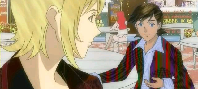 A arte de “Gankutsuou” é inacreditável, de uma originalidade e qualidade espantosas, mas isso não quer dizer que seja necessariamente o gosto de todas as pessoas… Acho que o imenso diferencial da série é a animação gráfica de alta qualidade, aliada a uma animação convencional bastante estilizada, mas boa, no geral. O que incomoda muito, a princípio, é o fcato de que as roupas e os cabelos dos personagens são feitos a partir de padrões estáticos, ou seja, o personagem se mexe mas os desenhos da roupa, ou o brilho do cabelo, não! A impressão que temos é que partes dos personagens são… transparentes, e que vemos um fundo atrás deles. No início é bastante confuso, mas depois que a gente se acostuma, acaba se tornando a marca do anime. O que me chamou a atenção logo no início é a semelhança de várias cenas com os quadros de Klimt (pintor austríaco), que trabalhava com colagens nesse mesmo esquema.
