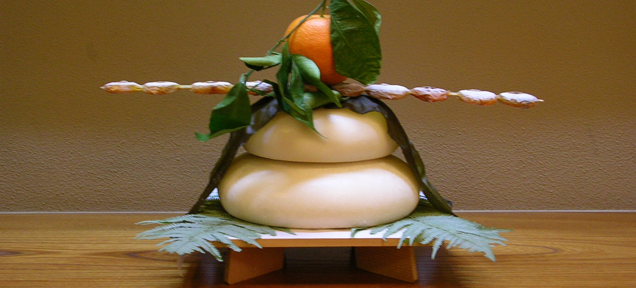 Durante esta altura, as casas são decoradas com a bandeira nacional japonesa e ornamentos especiais de ano novo, como o Kagamimochi, uma decoração feita de dois bolos de arroz (mochis) dispostos um sobre o outro e decorados com papel japonês, folhas de pinheiro) e daidai (espécie de laranja nipónica). O Kagamimochi é colocado sobre um altar como forma de agradecimento aos deuses budistas e xintoístas, especialmente Toshigami, o deus que, segundo a lenda, costuma visitar as residências no Ano Novo.