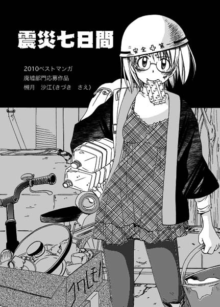 A professora de escola primária e artista de doujin Sae Kitsuki (槻月 沙江) vivia numa das áreas afectadas pelo terramoto, e criou este pequeno manga auto-biográfico a narrar as suas atribulações. Desenhado a grafite devido às réplicas, ela relata o estado do seu apartamento, o reencontro com os seus alunos e a mudança de hábitos enquanto os serviços de agua e electricidade não estavam reestabelecidos. Fica aqui o link (via Pixiv, em japonês):